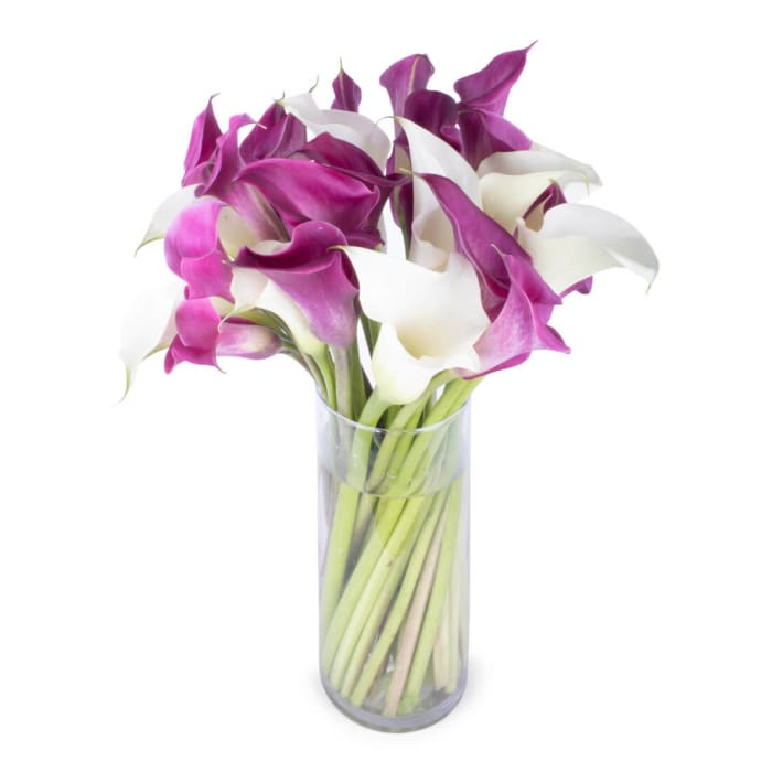 An exquisite display of two dozen trumpet-shaped blooms in the sweetest white-purple hues. This simple but classy Calla Lily flower arrangement makes a compelling and sophisticated centerpiece for all occasions.