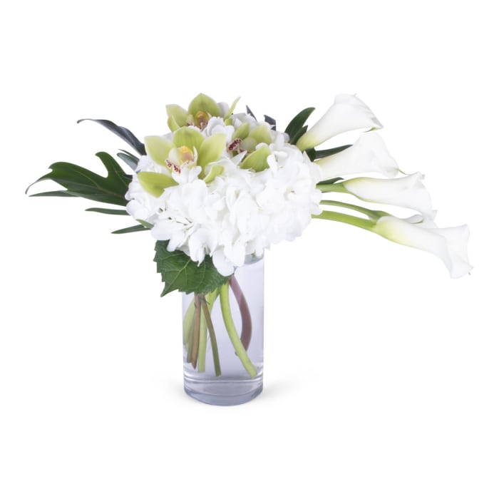 Moon dance. Romance. Elegance! Captivating callas, white hydrangea, exotic orchids in a stunning tall glass vase create a green and white dream come true. No matter who you send this fabulous arrangement to, you can be sure it will impress!