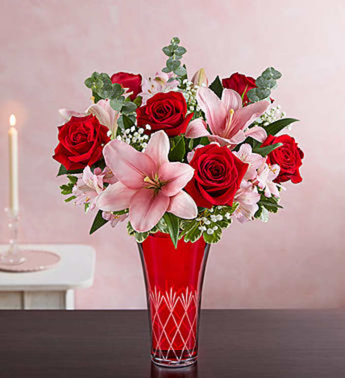 EXCLUSIVE Let your Valentine know she holds the key to your heart. Our romantic arrangement is hand-gathered inside our elegant, new, ruby red keepsake vase. Etched with a unique diamond-cut pattern, this exquisite design enhances the beauty of each bloom while reminding her that, like a diamond, your love is forever.