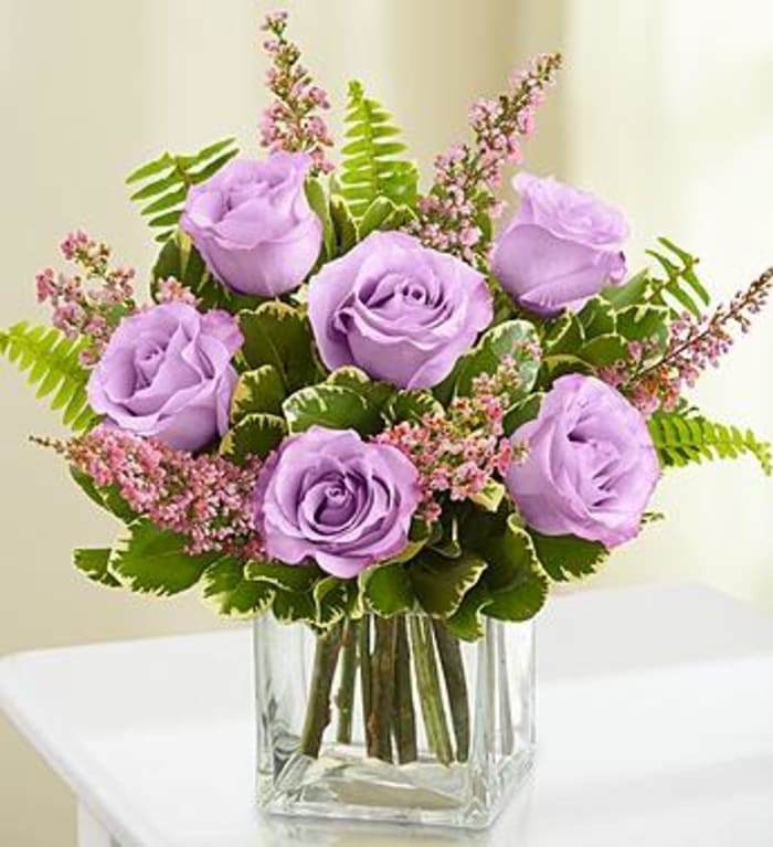 •Our florists select only the finest, freshest long-stem purple roses and arrange them by hand with fresh heather; available in bouquets of 6 stems or 3 stems