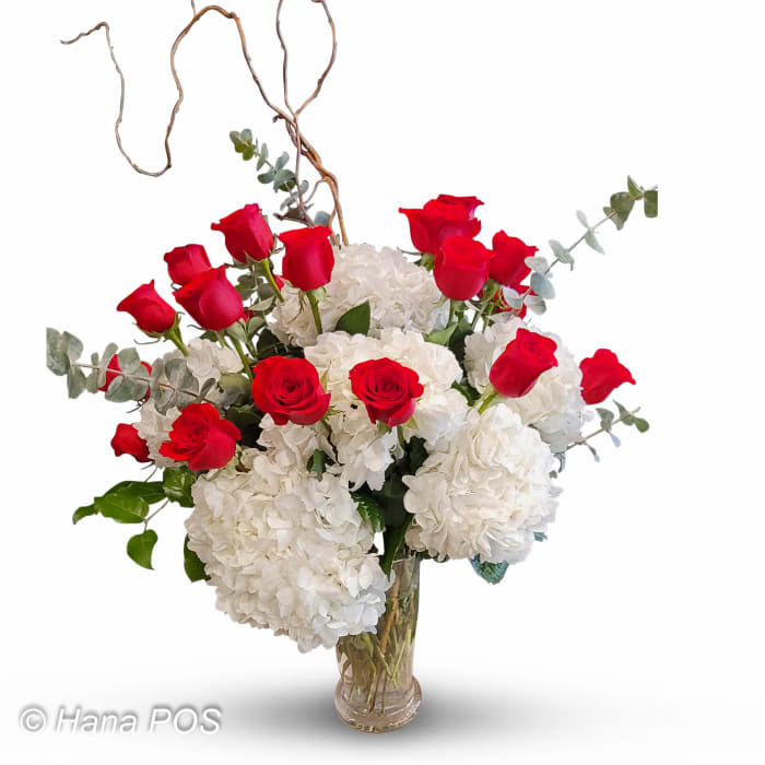 Go classy with the classic flower combination in red and white. The Arthur flower bouquet combines white hydrangea with red roses in a tall glass vase and creates an awesome romantic flower arrangement. Whether it’s your anniversary or your girlfriend’s birthday, it will surely grab some attention and receive a lot of admiration.